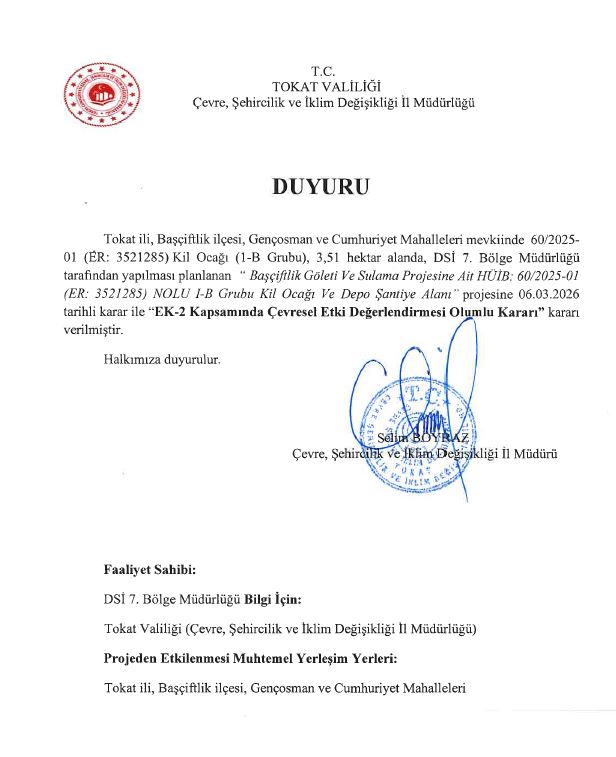 Tokat ili, Başçiftlik ilçesi, Gençosman ve Cumhuriyet Mahalleleri mevkiinde 60/2025-01 (ER: 3521285) Kil Ocağı (1-B Grubu), 3,51 hektar alanda, DSİ 7. Bölge Müdürlüğü tarafından yapılması planlanan “ Başçiftlik Göleti Ve Sulama Projesine Ait HÜİB: 60/2025-01 (ER: 3521285) NOLU I-B Grubu Kil Ocağı Ve Depo Şantiye Alanı” projesine. ilişkin Proje Tanıtım Dosyası, Çevresel Etki Değerlendirmesi (ÇED) Yönetmeliğinin 17. maddesi doğrultusunda incelenerek değerlendirilmiş ve söz konusu yönetmelik doğrultusunda Bakanlığımızın ÇED Yönetmeliği Yetki Devri konulu 2022/13 sayılı Genelgesi gereğince İl Müdürlüğümüz tarafından 06.03.2026 tarihli karar ile “EK-2 Kapsamında Çevresel Etki Değerlendirmesi Olumlu Kararı” kararı verilmiştir.