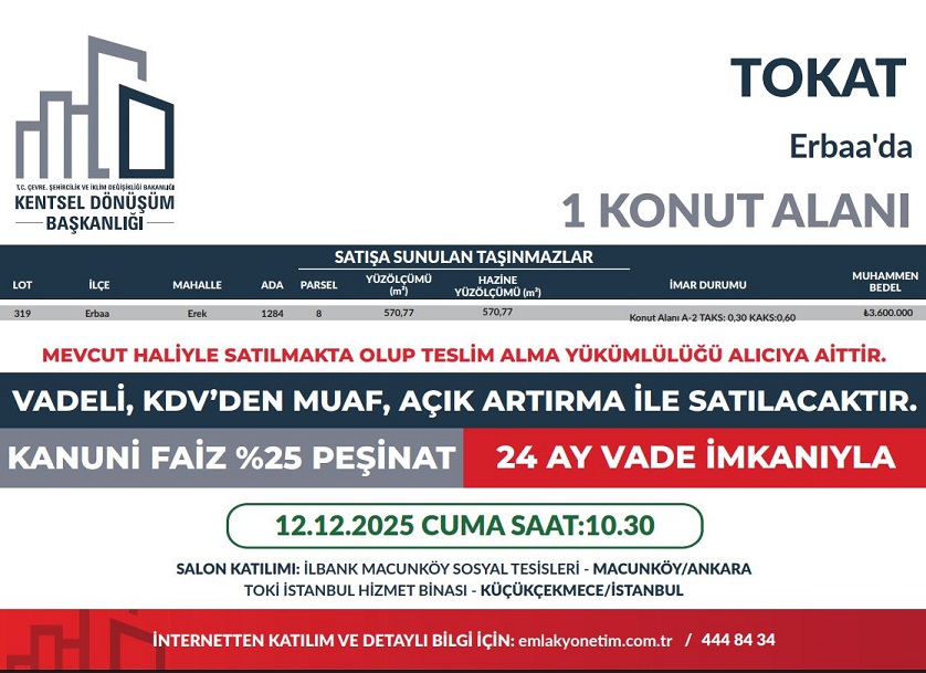 Tokat İli Erbaa İlçesinde 12 ARLIK 2025 tarihinde Açık Artırma Usulü İle 1 Konut Alanı Taşınmaz Satışı